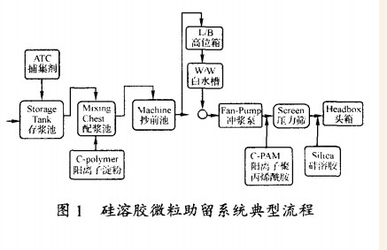 阳离子淀粉加在配浆池或调浆箱中,也可加到成浆池,使用量一般为w= 0.8 %一1.5 %( 绝干计) 。根据阳电荷需求量的大小,调节用量。相对讲,非木材纤维配比高的,淀粉的用量大些。阳离子聚丙烯酸胺加在冲浆泵或压力筛的进口处,使用量一般为100 - 300 mg/ kg。硅溶胶加在压力筛的出口处,使用量一般为1000一3000 mg/kg 。典型的加人位置如图1 所示。