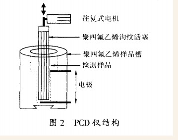 颗粒电荷测定仪的英文全称为Particle Charge Detectin ,简称PCD ,其结构如图2所示。测量原理:实际上所有水中的胶体溶解物和固体颗粒均带电荷,这导致在胶体表面产生集中的带相反电荷的离子,即所谓的平衡离子。胶体物质在样品槽中受到活塞的剪切作用,这些平衡离子与游离的高分子或颗粒分离,则可测量到一个流动电流值,即Zeta电位,用mV表示,并且显示出“+”或“一” 号。这时,用相反龟荷的标准液滴定样品,当流动电流为0 mV时,表示零电荷点,即样品中存在的所有电荷被中和。主要测量数据为消耗掉的标准液的体积, 再根据公式计算出样品的电荷需求量。
