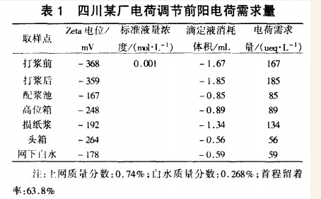 (1) 四川某厂,全竹浆生产文化用纸,纸机抄宽1.90 m,车速350 m/ min 。未使用硅溶胶微粒助留前,其首程留着率一直在60%左右,白水质量分数接近0.3 %。用PCD仪测其电荷需求量,发现阳电荷需求量较高,数据见表1
