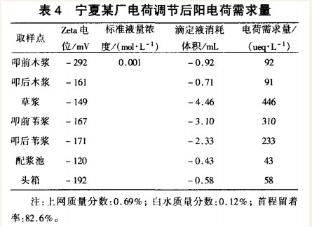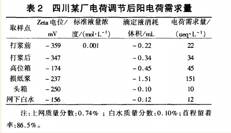 (2) 纸浆湿部电荷需求量直接影响到微粒助留效果。微粒助留系统通过改善整个纸机湿部的电荷平衡来达到好的留着效果。