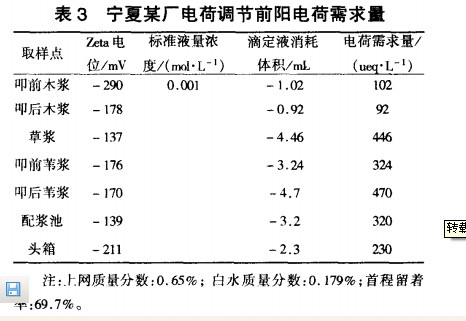 在整个微粒助留系统应用过程中,电荷需求是贯穿整个纸机湿部的重要参数。电荷需求量是指给定体积浆料的净电荷趋于零时所需的电荷量。不同的浆料含有不同程度的胶体物质,如木素、半纤维素,还有制浆及造纸过程中的添加剂等,一般,浆料系统中胶体物质带有负电荷,因此,纸浆负净电荷趋于零的电荷需求量称之为“ 阳电荷需求量”。整个浆料阳电荷需求量的大小直接反应了微粒助留系统的助留效果、纸机湿部的电荷平衡及阴离子垃圾的多少。阳电荷需求量越小,说明纸机湿部电荷越平衡、阴离子垃圾越少微粒助留系统效果越好。