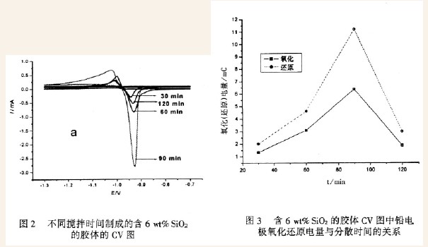 图2 和图4 分别是用不同搅拌时间制得的含6wt%,4wt%SiO2胶体的CV图,图3和图5是分别对应的峰电量与分散时间的变化图。由图可知,相同SiO2含量的胶体电解质中,纯铅电极的氧化、还原峰电流,峰电量随着分散时间的增加而增加,当达到一定分散时间时,出现最大值,分散时间长于一定值,其峰电流,峰电量出现大幅度下降。因为氧化峰和还原峰分别反映的是Pb氧化为PbSiO4, PbSiO4还原为Pt的反应,峰电流,峰电量的变化主要由H+,SO42- 离子的浓度及反应活性决定,而这些又取决于胶体网络结构和触变性的好坏。