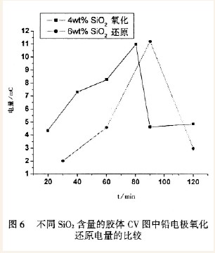 另外,图6 给出了不同SiO2含量的胶体CV图中铅电极氧化还原电量的比较,从图中可以看出,在分散较好的时候,SiO2含量为4 wt%与6 wt%时配制的胶体电解液Pt 电极的氧化电量相差不大。反而,分散对其的影响远远大于含量带来的影响。