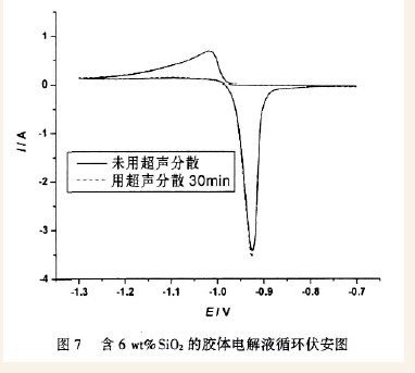 图7分别是气相含6 wt% SiO2经过90min机械分散后,在超声波中分散30min 的胶体电解液与没有在超声波中分散的胶体电解液的循环伏安图。从图上可以得知,超声分散后Pb 电极的氧化还原峰电流与没有超声分散的相当,初步说明超声分散对于气相SiO2在胶体电解质中的分散基本没有帮助。通常用超声波将分散剂(水或有机溶剂) 中的团聚体打碎,其原理是由于超声频振荡破坏了团聚体中小微粒之间的库伦力或范德华力,从而使小颗粒分散于分散剂中。但对于机械分散后的胶体,超声分散没有显现出效果,说明机械分散后气相SiO2已在硫酸溶液中形成了由化学键与氢键共同作用的较稳定的结构。