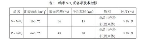 纳米SiO2 是无定形白色粉末(指其团聚体),微粒结构非常特殊,表现出奇异或反常的物理化学特性,具有卓越的光、力、电、热、磁、放射、吸收等特殊性能。颗粒表面存在不饱和的残键及不同键合状态的羟基,具分子状态呈三维链状结构(或称三维网状结构、三维硅石结构等)。纳米SiO2 的各项技术指标如表1 所示。