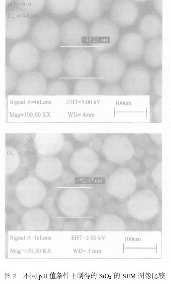 硅溶胶二氧化硅平均粒径的测定: 在氯化钠水溶液中( wNaCl = 0.2 g) , 以氢氧化钠滴定二氧化硅表面的硅烷醇基团, 记录p H = 410~910 消耗的氢氧化钠标准溶液的体积, 由经验公式求出二氧化硅颗粒的比表面积S , 然后再求出二氧化硅颗粒的平均粒径。硅溶胶二氧化硅颗粒的均匀性及分布情况采用扫描电子显微镜(SEM) 进行考察。