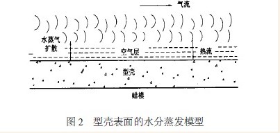 型壳的干燥首先是表面的水分蒸发,然后内部的水分不断向表面迁移。型壳表面的水分蒸发模型如所示,蒸发过程需要吸收热量,热量来源于制壳间的热空气。由于分子间的相互作用力,即便在有气流流过型壳表面的情况下,在型壳的蒸发界面上仍然存在着相对停滞的空气层,热量必须通过空气层才能传导到型壳表面,使表面的水分进一步蒸发,而水蒸气也要透过空气层向外扩散,方向与热流方向相反。热量和水蒸气的传递速度与空气层的厚度有关。