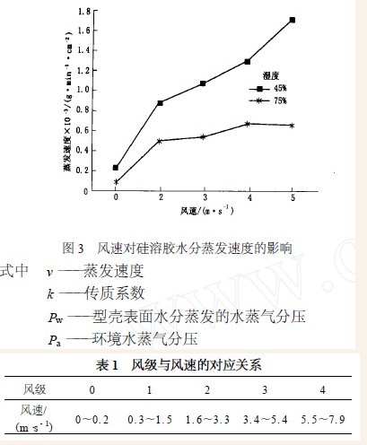 加快型壳表面的空气流动速度能够使蒸发界面上的空气层变薄,加强热量的传递和水蒸气向外的扩散,从而增加型壳的干燥速度。在实验室中对硅溶胶胶液在不同风力下的干燥过程进行测量,结果见图3。从图3 中可以看出,不同风力下,水分从硅溶胶胶体中蒸发的速度有明显差别,在45 %的湿度情况下,处于5 m/ s风速下硅溶胶水分的蒸发速度是无风状态下的7. 5 倍,即便在75 %的高湿度情况下,5 m/ s 和无风状态的硅溶胶水分的蒸发速度也相差6. 7 倍。表1 给出了风速与风级的对应关系。