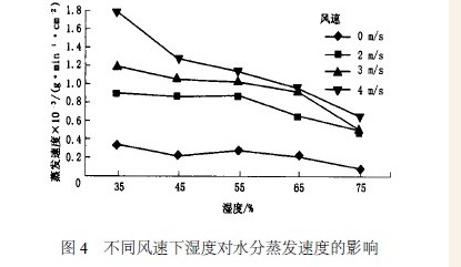 在湿度大的型壳间,环境水蒸气的分压Pa增大,而型壳表面的水蒸气分压与该处的温度有关,在温度基本恒定的情况下,湿度增大使型壳表面的水分蒸发速度降低,从而降低了型壳的干燥速度。图4 是在实验室测定的不同风速条件下,硅溶胶蒸发速度与湿度的关系。数据表明,随着湿度的降低,硅溶胶的水分蒸发速度加快。但要获得更高的蒸发速度,必须加大制壳间的空气流动速度。