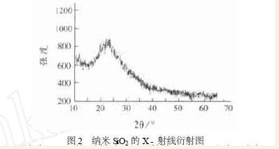 纳米SiO2 的X—射线衍射(XRD)图见图2。由图2 可见,在2θ= 23°处出现了一个馒头峰,表明该SiO2样品为非晶态物质所组成。