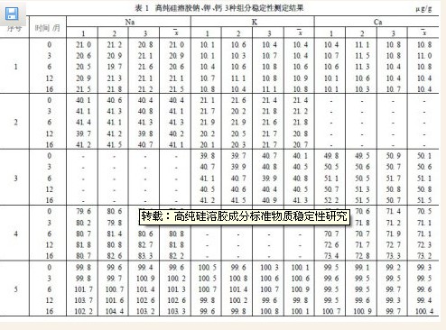 对于高纯硅溶胶成分标准物质,不但要保持硅溶胶的状态不发生凝胶,最根本的是保持各成分的稳定。为了评价高纯硅溶胶成分的稳定性,在贮存期间定期对物料进行抽样测定。每一次抽样测量过程中,尽可能控制各种条件,使其趋于一致,尽量使测量结果之间的差异能反映出物质变化所引起的那一部分误差。