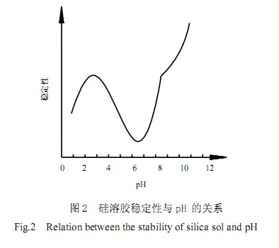 硅溶胶的稳定性与pH之间的密切关系如图2所示。从图2可以看出,在低pH(<2.0)区域内,溶胶稳定性随pH的升高略有上升;在中部pH(2<pH<4)区域内,酸性硅溶胶具有一个较为宽阔的亚稳定区域,为制备酸性硅溶胶的可能性提供现实依据;在pH接近5~6的区域范围内时,硅溶胶的稳定性迅速下降。
