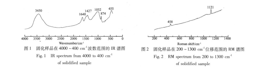 在天然的硅酸盐矿物中 ,硅氧四面体的连接方式各不相同 ,按硅氧骨干的组成可分为 6 ,即岛状、二聚体状、环状、链状、层状和架状。在聚合的硅氧骨干中,有两种 Si-O键的基本形式 ,: ①Si-Onb - ,Onb 2 表示非桥氧或末端氧; ②Si-Obr -Si,Obr表示桥氧。在整个硅酸盐系列的拉曼光谱中 , Si2 Onb 2 的伸缩振动频谱在 8001250 cm cm- 1之间 , Si-Obr -Si的反对称伸缩加弯曲振动频谱在 450760 cm- 1之间 ,并随着 [ SiO4 ]由孤立架状结构的变化 , SiOnb-的伸缩振动由 850 cm- 1逐渐增大到 1250 cm- 1, Si-Obr-Si的弯曲振动从 760 cm- 1逐渐减少到 467 cm- 1,形成了典型的规律性递变 ,因此 ,利用拉曼谱能较好鉴定硅酸盐矿物。水玻璃与氯化铝反应后形成的这种非晶态高含水凝胶状产物可能是固化后形成了特殊结构的硅酸盐材料。同时 ,水是很弱的拉曼散射物质 ,其对拉曼散射光谱的影响非常小。因此 ,本文采用拉曼光谱仪对其进行分析。图 2为固化样品 (固化剂浓度均为 2 mol /L,胶凝剂与固化剂的体积比为 4∶ 1) 2001300 cm- 1位移范围的 RM谱图。从图 2<, S, style="mso-hansi-font-family: 'Times New Roman'; mso-bidi-f, ont-family: 'Times New Roman'; mso-ascii-font-family: 'Times New Roman'" PAN>可以看出 , 458 cm- 1附近有拉曼位移 ,其正是 Si-Obr-Si的弯曲振动 ,说明固化的胶凝材料中确实存在硅酸盐的聚合反应 ,形成了硅酸盐的聚合物 ,且其聚合程度较高。