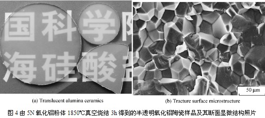 图3为5N氧化铝粉体烧结样品的显微结构照片。图3a为1400℃烧结样品的断面照片,从断面照片可以看出陶瓷还没有烧结,致密度低、气孔率较高,晶粒还没发生长大,大约1μm。图3b为1500℃烧结样品的断面照片,从断面上可以看到陶瓷体出现了一定程度的烧结,显气孔率明显下降,晶粒尺寸开始发育长大,达到2~3μm。烧结温度增加到1 600℃,陶瓷的致密化更为显著,断面上观察到的气孔显著减少,晶粒尺寸长大到大约5μm(见图3c)。图3d为CR–10氧化铝粉体在1600℃烧结样品的断面形貌照片,与5N氧化铝粉体相比,CR–10烧结样品也存在少量的气孔,晶粒尺寸大小相当,这表明5N氧化铝粉体经过3h球磨处理后烧结性能已经和法国CR–10氧化铝粉体非常相近。将球磨后的5N氧化铝粉体干压成型后再经200 MPa冷等静压处理,置入真空钨丝炉中在1 850℃保温3 h,得到了如图4a所示的透明氧化铝陶瓷样品。从图4b的断面显微结构照片来看,透明氧化铝陶瓷的平均晶粒尺寸在40μm左右,未见明显的气孔存在,具有比较高的致密度。分别对5N氧化铝粉体和CR–10氧化铝粉体制备的半透明氧化铝陶瓷的直线透过率进行了测试,结果见图5。由图5可以看出:在波长为200~1 100 nm时,两者的直线透过率数值相差不大,其中,球磨后的5N氧化铝粉体制备的半透明氧化铝陶瓷的直线透过率最大值达到16%。以上说明5N氧化铝粉体制备的半透明氧化铝的水平已经和CR–10氧化铝粉体制备的样品水平相当,进一步优化制备工艺可望取代CR–10氧化铝粉体,从而降低半透明氧化铝产品的生产成本。