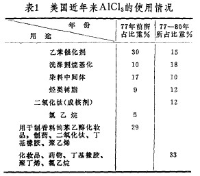 近年来美国三氯化铝的用途列于表1。