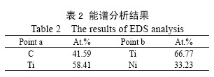 为了研究单晶内部的微观结构,对单晶横截面做了SEM 和EDS 分析,分析结果如图2 和表2 所示. 图2(a)是试样表层附近的SEM 形貌,从中可以观察到TiNi 基体与石墨模壳接触处生成了较多的颗粒状相,有些颗粒也从表层脱落(如箭头I 所指处),进入基体内部. 箭头I处的能谱分析结果(表2 点a)表明,该颗粒状相为TiC碳化物. 图2(a)中箭头II 所指处即为分布于枝晶间的类似鱼骨状相,如图2(b)所示,其平均直径为1~2 μm. 对图(b)中箭头a 处进行能谱分析(表2 点b),确定该相为Ti2Ni 相. 图2(b)中箭头b 所指小颗粒的成分与图(a)箭头I 所指颗粒状相一致,是在基体内部析出的TiC 相.