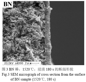 对BN 和TiNi 的界面反应的研究以热压BN 为研究对象,分析其与TiNi 反应的机理. 实验具体步骤如下,将热压BN 棒浸入高温熔融的TiNi 熔体中,保持不同的时间,得到BN/TiNi 的反应界面. 通过SEM 对界面的形貌进行分析,通过EPMA 对界面进行成分分析.本工作合成了CaZrO3 复合耐火材料;用模压法成型,分别在1650℃和1680℃烧结制备成了实验用坩埚.然后分别用商用CaO 坩埚和自制CaZrO3 坩埚进行了TiNi 熔炼实验. 实验过程如下:在感应炉中熔化TiNi合金,在真空条件下(真空度小于5 Pa),于1500℃保温5 min. 用SEM和EDS 对试样的界面反应做了形貌和成分分析.
