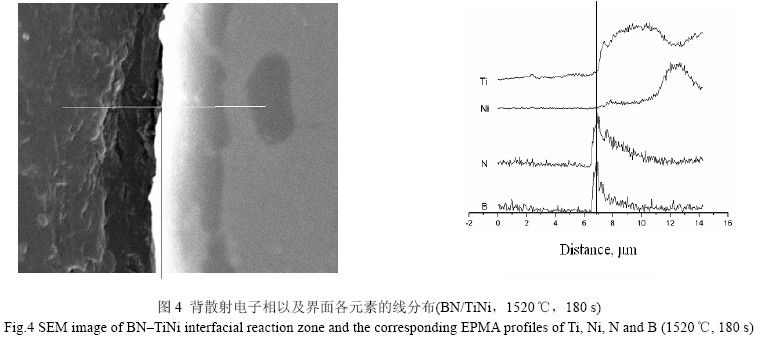 图3 是BN试棒浸入1520℃的TiNi 熔池中保持180s 得到的反应层形貌,选取自然断面拍摄的SEM 照片.从图中可以清晰的看出BN 层片状的组织形貌. 附着在BN 基体表面为BN 与TiNi 合金形成的反应生成物,其厚度约为1~2 μm. 图4 是BN/TiNi 界面的背散射电子相和各元素分布曲线. 图像中黑线左侧为镶样材料,右侧为界面和相邻金属基体. 从界面处向金属一侧,随着离开界面距离的增加,B, N 含量总体呈下降趋势;Ti, Ni含量总体呈上升趋势. 距离界面约4 μm 以上B, N 含量趋于平衡,接近0;Ti, Ni 的含量总体趋于平衡,但在不同的相中分布不均匀.