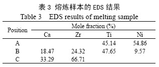 用CaZrO3 坩埚进行的熔炼实验的检测结果如图5和表3 所示. 结果表明,用CaZrO3 坩埚将熔化TiNi 合金后,液态钛合金和耐火材料的界面反应层厚度约为30μm,相互间的元素无相互扩散. 为了了解CaZrO3 材料是否能用于其他高温Ti 合金的熔炼,尚需开展一系列系统的深入的研究工作,详细研究结果将另行发表.