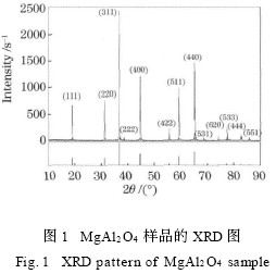 99. 99 %) 为原料,用异丙醇和水的混合液将异丙醇铝水解,并以醇水混合液将氧化镁均匀分散,按物质的量比n(Mg) ∶n(Al) = 1∶2混合球磨12 h ,干燥后研磨,在不同温度下焙烧得到MgAl2O4 粉体。经X射线衍射仪(XRD) 粉末衍射分析,得到在1400 ℃时样品的XRD 图谱(如图1 所示) 与镁铝尖晶石的标准卡片(86-0083) 十分吻合。使用同样的方法,在混料时按物质的量比加入碳酸锰(MnCO3 ,AR)和氧化铬(Cr2O3 ,AR) ,于1400 ℃在活性碳覆盖下烧结12 h 合成Mg1 - xAl2 (1 - y) O4 ∶xMn2 + , yCr3 + 。