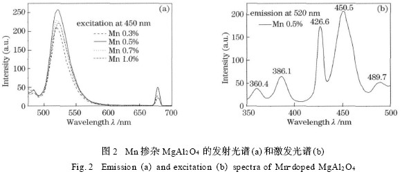 由于所制备的粉体样品测得的吸收光谱图质量不高,所以通过实验测得Mg0. 995 Al2O4 ∶0. 005Mn2 +在520 nm 监测时的激发光谱,如图2 (b) 所示,用来辅助解释Mn2 + 离子的发光过程。激发光谱中的峰与其吸收光谱中的峰的位置基本一致,分别对应由基态6A1 到激发态4 T1 (4 G) ( 490 nm) ,4 T2 (4 G) ( 450 nm ) ,4A1 / 4 E (4 G) ( 427 nm ) ,4 T2 (4D ) (386 nm) 和4 T1 (4 P) / 4 E(4D) (360 nm) 。电子吸收能量后跃迁到较高激发态后,通过弛豫到达最低激发态4 T1 (4 G) ,然后发射出520 nm 的光子,并最终回到基态6A1 。