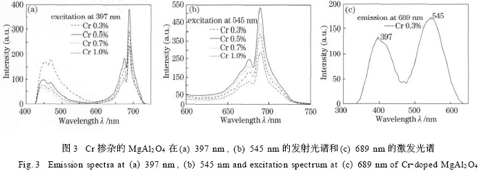 图3(a) ,(b)是MgAl2(1 - y) O4∶yCr3 + 分别在397 nm和545 nm激发时的发射光谱,样品在两种波长激发下均获得676 nm 和689 nm 左右的红光发射,并且在Cr3 + 的掺杂摩尔分数为0. 5 %时发光强度最大。这两个发射峰分别对应Cr3 + (3d) 3 电子由激发态2 T1g ,2 Eg