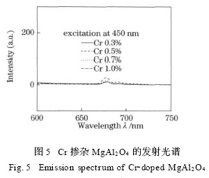 通过实验可以看到单掺Mn2 + 的MgAl2O4 可以获得绿光,而单掺Cr3 + 离子可以获得红光。比较两种不同离子掺杂样品的光谱图可以发现,其中Mn2 + 离子掺杂的发射光谱[ 图2 (a) ]和Cr3 + 离子掺杂的激发光谱[ 图3 ( b) ]在500~600 nm波长范围内有很大一部分发生重合,同时Cr3 + 离子掺杂的发射光谱[ 图3 (a) ]和Mn2 + 离子掺杂的激发光谱 [图2 (b) ]也在430~470 nm 左右的范围内有重合,说明在Mn2 + 离子和Cr3 + 离子之间存在能量传递的可能。据我们所知,关于Mn2 + ,Cr3 + 离子在镁铝尖晶石体系中的能量传递还没有文献报道过,因此本文对此进行了研究。用450 nm 波长激发Mg0. 995Al2 (1 - y) O4 ∶0. 005Mn2 + , yCr3 + 粉末获得的发射光谱如图4 所示,得到的光谱中同时含有Mn2 + 离子的绿光(515 nm) 发射和Cr3 + 离子的红光(677 nm , 694 nm) 发射,相比单掺的样品,两种发光的峰位都出现少量偏移,这可能与双掺后晶格的畸变增加有关。固定Mn2 + 离子的掺杂摩尔分数为0. 5 % ,改变Cr3 + 的浓度,发现Mn2 + 离子的发光强度逐渐下降,而Cr3 + 离子的发光强度随着掺杂浓度的增加而增加,在掺杂摩尔分数为0. 5 %时达到最大,随后其发光强度随着掺杂浓度的增加而减小,出现浓度猝灭。从图3 (c) 可以看出Cr 离子的激发峰是一个宽带峰,使用450 nm 激发单掺Cr3 + 离子的MgAl2O4 粉末,在和双掺样品同样的测试条件下,各个浓度样品中监测到的Cr 离子的红光发射强度十分微弱(图5) ,而当掺杂了Mn2 + 离子后,Cr3 + 离子的红光强度有了明显的提高,说明Mn2 + 离子对Cr3 + 离子的发光有敏化作用,而双掺样品中Cr3 + 离子677 nm 和694 nm 发射增强的能量主要来自Mn2 + 离子的能量传递。用同样的方法研究了Cr3 + 离子对Mn2 + 离子的能量传递,由于Cr3 + 离子对Mn2 + 离子的敏化作用很弱,在397 nm激发下双掺样品只有很弱的绿光发射,实现白光的可能性不大,应用价值较低,因此本文不加讨论。