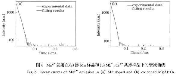 离子间的能量传递有多种方式,本文所研究的Mn2 + 为过渡族元素中比较典型的分立发光中心,不可能通过载流子传递能量。而通过测量荧光粉的荧光寿命, 可以看到, 在450 nm 左右波长激发, 515 nm左右波长监测条件下,测得Mg0. 995 Al2O4 ∶0. 005Mn2 + 样品中的Mn2 + 离子荧光寿命如图6 (a)所示为18. 4μs ,而在Mg0. 995Al1. 994O4 ∶0. 005Mn2 + , 0. 003Cr3 + 中Mn2 + 离子的荧光寿命如图6 (b) 所示为19. 2 μs ,随着掺Cr 的摩尔分数增加到0. 5 %,0. 6 % ,0. 7 % ,0. 8 % ,测得Mn2 + 离子的荧光寿命依次为20. 0 ,17. 49 ,20. 54 和19. 46μs ,其荧光寿命并没有因为Cr3 + 离子的加入而减少,因此可以判断Mn2 + ,Cr3 + 离子之间的能量传递也不是以共振传递方式进行的。