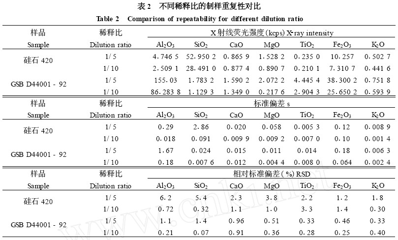 分析试验了样品与熔剂稀释比为 1/ 5 和1/ 10的熔融方法 , 考察了熔融效果及制样的重复性。选用高硅 ( 420 号硅石) 和高铝 ( GSB D44001292) 标准样品各一个 ,每个标样在不同的稀释比下制得熔片 10 片 ,制样的重复性对比列于表 2 。