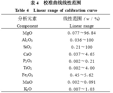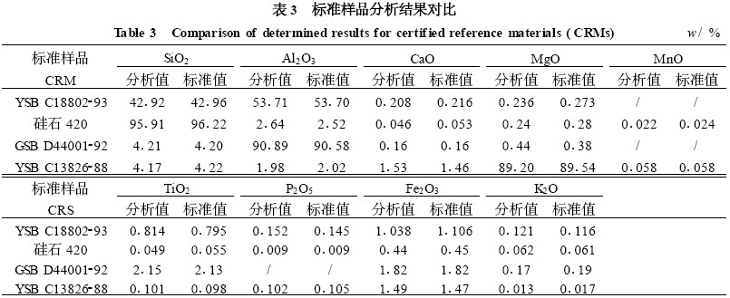 对于SiO2,基体校正后的分析结果要好于基体校正前的结果;而对于低含量元素如MnO, TiO2,P2O5, Fe2O3, K2O,基体校正前后没有本质 差别;而对于Al2O3和MgO , 校正前后结果均不太理想,考虑到含量范围较宽,于是采用分段回归。其中SiO2采用理论α系数法校正,分2段制作回归曲线;其余元素均未做校正,Al2O3分成3段制作回归曲线, MgO分成2段制作回归曲线;分析结果见表3。
