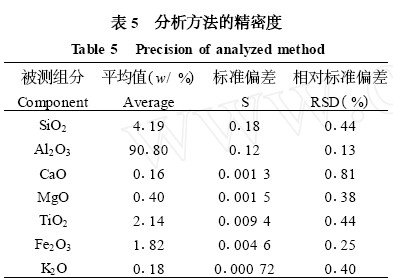 采用本法对国家一级标准物质GSBD44001- 92 (高铝砖)熔融制备10个样片,按表1的分析条件进行测量,将所得结果进行统计,见表5。由表5的数据可以看出,本法有较好的精密度,能满足分析要求。