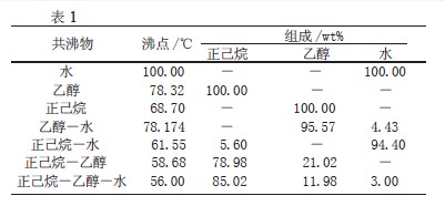 当正己烷被加入乙醇-水系统以后可以形成4种共沸物,一是正己烷-乙醇-水三者形成1个三元共沸物,二是它们两两之间又可形成3 个二元共沸物。在标准状态压力下,各组分、共沸剂及其所形成的各种共沸物的沸点和组成如表1 所示。