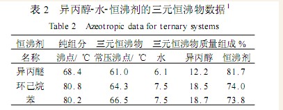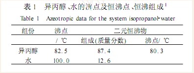 工业上经常需要从异丙醇水溶液中回收其中的异丙醇。例如 ,萘普生原药的生产过程中就有一定数量的含水为 12.6%的异丙醇水溶液需要脱水 ,要求异丙醇中水含量小于 0.5%。由于异丙醇和水形成共沸物(见表1),因此不能用一般的蒸馏法制得无水异丙醇。目前 ,最具工业意义的是三元非均相恒沸精馏脱水法。