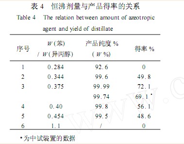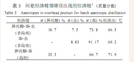 恒沸剂的加入是为了与被分离物形成恒沸物 ,因此应该按恒沸物中溶剂组成进行物料衡算以确定恒沸剂加入量 ,对于连续流程 ,若低于或高于此用量均得不到合格产品 。对于本文所采用的单塔间歇恒沸精馏塔 ,恒沸剂用量的计算较复杂 ,不仅因为是间歇精馏 ,而且馏出物依次为异丙醇-水-苯三元非均相恒沸物 ,苯-水二元非均相恒沸物和异丙醇-苯二元恒沸物(见表 3) ,但类似这种情况的恒沸剂用量的计算方法尚未见报导。为此我们通过实验进行了测定。