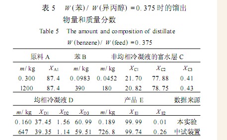 表4 中的“得率 %”= (合格的产品量/( 原料量×87.4%)) ×100%,由表 4 可知 ,恒沸剂苯与原料的质量比为 0.284 和 1.1 时均得不到合格产品 ,故得率为零 ,最佳(苯/异丙醇) 比值为 0.375,在该条件下 ,得到的实验数据列于表 5。