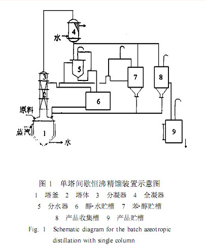 塔釜 1 为带蒸汽夹套的釜 ,装料容积为 3m3 ,塔径 D =0.4m,填料高度为 H =11.9m,由 4 节塔节构成 ,填料为波纹丝网填料 (ZY-1 型) 。分凝器 3为列管式 ,换热面积为 A =10m2。5 为分水器 ,两相(苯与醇-水相) 在此分层 ,材质为玻璃 ,分层相面清晰可见。6 为醇-水贮槽 ,容积为 V =2m 。7 为醇-苯贮槽。8、9 为无水异丙醇槽 ,体积 V =1.0m3。