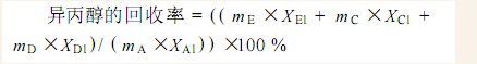 表5 中的X分别为原料 A 或各馏分 (B、C、D、E )中醇、水、苯的质量分数 ,其中 j =1 为异丙醇 , j=2 为水 ,j =3 为苯。均相冷凝液留待下一釜作为恒沸剂 ,原料加入按均相冷凝液中的苯和异丙醇含量折算 ,使 W(苯)/W(异丙醇)=0.375,富水层累积到一定量后 ,经自夹带非均相二元恒沸精馏从塔顶得到的异丙醇-水二元恒沸物则供三元恒沸精馏用。因此除了用表 4 的“得率”来评价单塔间歇恒沸精馏塔的操作外 ,有必要用“回收率”来反映异丙醇的损耗情况 ,“回收率”由下式计算: