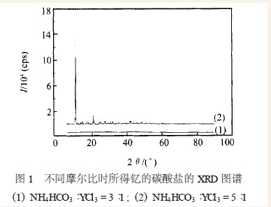 我们对摩尔比为3∶1 和5∶1 时所得沉淀物进行XRD 物相分析, 所得图谱见图1 。可以看出, 摩尔比为3∶1 时, 所得沉淀的XRD 图谱为弥散的衍射峰, 峰形很宽, 峰位很低, 证明沉淀物是非晶粉体, 主要是无定型的碳酸钇。摩尔比为5∶1 时, 所得沉淀的XRD 图谱显示出完好的衍射峰, 峰形狭长, 表明沉淀物结晶好, 晶形完整, 为碳酸钇铵。