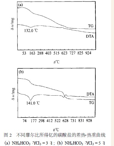 NH4HCO3 和YCl3 的摩尔比分别为3∶1 和5∶1时所得沉淀物的差热-热重曲线见图2 。摩尔比为5∶1时沉淀物的DTA 曲线有两个较强的吸热峰。第一个吸热峰与其脱水相对应, 峰值温度为141. 0℃, 第二个吸热峰值温度为609. 0 ℃, 为部分碳酸盐分解过程, 两峰之间的平缓曲线为另一部分的碳酸盐分解过程, 对应的TG曲线上则表现出3 个失重阶段。摩尔比为3∶1 时沉淀物的DTA 曲线仅有一个很宽的吸热峰, 而对应的TG曲线上仅表现出脱水和碳酸盐分解两个失重阶段。由此也可以说明在不同摩尔比条件下所得沉淀物是不同的。
