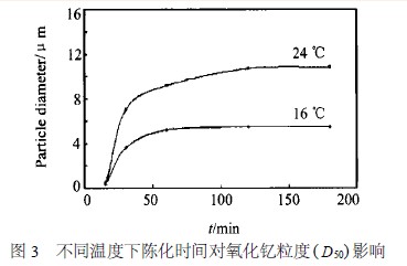 NH4HCO3 和YCl3 的摩尔比为5∶1 , YCl3浓度为0. 5 mol·L - 1 , NH4HCO3浓度为0. 5 mol·L - 1 , 反应温度分别为16 和24 ℃时陈化时间对氧化钇粒度的影响结果见图3 , 可以看出, 当陈化时间小于60 min 时, 氧化钇粒度随陈化时间增加而增大; 当陈化时间大于60 min 时氧化钇粒度随陈化时间变化不大。我们从16 ℃陈化15 和60 min 所得沉淀物的XRD 图谱( 该图与图1 近似) 可知, 陈化15 min时所得沉淀物是无定型的碳酸钇, 而陈化60 min 后所得沉淀物是晶型碳酸钇铵。因此, 随着陈化时间的增加,沉淀产物经历着从无定型的碳酸钇向晶型的碳酸钇铵转变及碳酸钇铵晶体长大的过程。陈化时间大于60 min 后, 碳酸钇铵晶体基本上完整形成, 其粒度随时间的变化没有太大的波动。