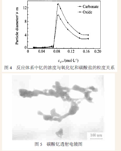 在固定陈化时间60 min , 反应体系温度为16 ℃, 摩尔比为5∶1 , 我们研究浓度对氧化钇及钇的碳酸盐的粒度的影响, 实验结果见图4 。可以看出, 反应体系中钇的浓度小于0. 07 mol·L -1 (反应体系中钇的浓度并非氯化钇料液的浓度, 而是氯化钇的摩尔数除以加入碳酸氢铵后溶液的总体积所得浓度) 时所得钇的碳酸盐和氧化物的粒度几乎都小于0. 5 μm ; 反应体系中钇的浓度为0. 07~0.08 mol·L -1 , 钇的碳酸盐和氧化物的粒度突然增大, 然后又随着反应体系中钇的浓度的增加逐渐减小。对反应体系中钇的浓度为0. 04 mol·L -1时所得沉淀进行XRD 和TEM(图5) 分析可知, 在该浓度下所得沉淀物以无定型的碳酸钇为主。