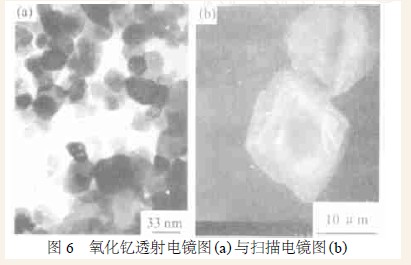 我们对反应体系中钇浓度为0. 04 和0. 08mol·L -1条件下所制备的氧化钇分别进行透射电镜和扫描电镜(图6) 观测, 从图中可见, 低浓度条件下所得氧化钇粉体颗粒细小但有团聚, 该团聚大多是由许多具有规则几何形状粒径大约为30~50nm 的氧化钇微晶聚集而成。高浓度条件下所得氧化钇粉体为实心颗粒, 分散性好, 晶型完整。