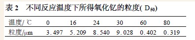 NH4HCO3 和YCl3 的摩尔比为5∶1 , YCl3 浓度为0. 5 mol·L -1 , NH4HCO3 浓度为0. 5 mol·L -1 , 搅拌陈化时间60 min , 温度对氧化钇粒度影响的实验结果见表2 。从表2 看出, 当反应温度较低( < 30℃) 时, 所得氧化钇粒度随温度的升高而增大, 氧化钇的粒度为微米级。当反应温度较高时, 氧化钇粒度随温度升高很快降低, 直至亚微米级的程度。