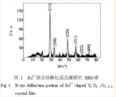 以氧化钇( Y2O3 ,纯度> 99. 99%) 、碳酸钙(CaCO3 , 纯度> 99. 0% ) 、钛酸四丁酯[ Ti(OC4H9 ) 4 ,纯度> 99. 0% ]和氧化铕( Eu2O3 ,纯度> 99. 99% ) 为主要原料, 乙二醇甲醚(CH3OCH2 CH2OH,纯度> 99. 0% )为溶剂,乙酰丙酮(C5H8O2 ,纯度> 99. 0%)为鳌合剂,用sol-gel法制备钛酸钇前驱液。具体过程如下:按一定摩尔比称量氧化钇、氧化铕和碳酸钙溶解于适量的稀硝酸中[ n (Eu) ∶n (Y +Ca) = 5% ] ,加热搅拌得溶液A;将钛酸四丁酯溶解于乙二醇甲醚中,加入适量的乙酰丙酮,搅拌成均相得溶液B;将溶液A缓慢的滴加到溶液B中,继续搅拌形成黄色透明的钛酸钇溶胶。采用旋涂( sp in coating)的方法在石英基片上镀膜,甩胶速率2 000 r/min,时间为30s。得到的凝胶膜在120 ℃的烘箱中热解15 min,然后在600 ℃下烧结2 h即得所需薄膜样品,多次涂胶和热处理可得到较厚的薄膜。