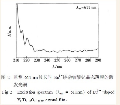 3. 由于Eu—O电荷迁移带(CTB)的吸收作用, Eu3+掺杂的Yx Ti1 - xO1 - 0. 5x薄膜在短波紫外区可被有效激发,紫外氙灯、准分子激光器、汞灯等可用作这种发光薄膜的激发源。