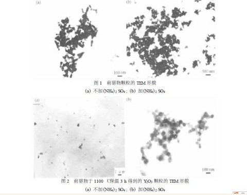 为研究SO42 - 对前驱物和煅烧产物粒度和颗粒形貌的影响, 在其他条件相同的情况下, 采取向前驱物生成体系中不加(NH4 )2SO4 和加入微量(NH4) 2 SO4 以进行对比。结果发现没有(NH4)2SO4加入时, 反应生成的前驱物将很快沉淀下来, 而有适量(NH4) 2 SO4 加入时, 则可得到前驱物溶胶, 图1 和2 分别为两种情况下所得的前驱物颗粒及其在1100 ℃下保温3 h 所得Y2O3 颗粒的TEM 形貌。