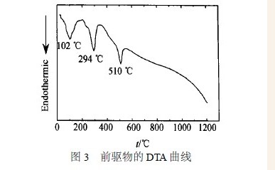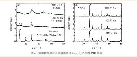 图3 为前驱物的DTA 曲线, 从图中可以看出,各峰均为吸热峰, 表明在该处发生了明显的物相变化, 结合图4 中前驱物及其在不同煅烧条件下产物的XRD 曲线可以看出: 前驱物的主要成分为Y2 (OH)5(NO3) 0. 86·H2O , 前驱物的DTA 曲线于102℃处的吸热峰主要是因前驱物中的吸附水、结晶水和结构水脱除引起的; 此时, 前驱物Y2 (OH)5(NO3) 0. 86·H2O 转变成α2Y(OH)3 相, 在294 ℃的吸热峰表明α2Y(OH)3 进一步失水转变为单斜结构的YOOH 相, 在510 ℃的吸热峰表明中间相开始向体心立方结构的Y2O3 相转变; 因此,前驱物在煅烧过程中的物相变化为: Y2(OH)5(NO3) 0. 86·H2O →α2Y(OH)3 →YOOH →Y2O3