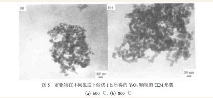 将工业生产的纯度为99. 99 % , 平均粒径5μm的Y2O3粉溶于分析纯的浓硝酸, 加去离子水配制成浓度为0. 26 mol·L - 1的Y(NO3)3 溶液, 称取微量分析纯的(NH4)2SO4 添加到Y(NO3)3 溶液中, 用磁力搅拌器搅拌数分钟, 将浓度为1 mol·L - 1的氨水溶液滴加到剧烈搅拌的Y(NO3)3 溶液中, 滴定时将反应体系置于冰水混合物中, 使反应体系的温度维持在0 ℃上下, 氨水的滴加速度控制在2 ml·min -1以下, 当反应体系的pH = 8. 5 时, 停止滴加氨水, 继续搅拌溶液, 时效5 h , 时效温度仍维持在0 ℃上下, 时效结束后, 得到前驱物溶胶,将溶胶用去离子水洗涤两次, 以去除溶胶中多余的NO3- , NH4+ 等离子, 再用丙酮将溶胶洗涤两遍, 以去除溶胶中多余的水份, 而获得前驱物凝胶, 凝胶干燥采用室温下氮气吹干。将干燥后的前驱物粉料装入石英烧舟内, 于流动的氧气气氛中在不同温度下进行煅烧。