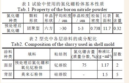 试验所用氮化硼粉体由北京某公司提供,其主要指标如表1 所示。氮化硼复合型壳的制备工艺为:按照表2 的比例将经过处理的氮化硼、氧化钇和少量添加剂(JFC 型表面活性剂、辛醇)放入钇溶胶中,配制成涂料;将氮化硼涂料均匀地涂挂在蜡型表面,撒100 目氧化钇砂,待涂层充分干燥后重复一次;待型壳面层充分干燥后涂挂背层,背层涂料则由莫来石和硅溶胶组成(配比见表2),背层撒砂分别用40 目和20 目莫来石砂,重复五次;待型壳充分干燥后,使用微波炉对型壳脱蜡;脱蜡后的型壳在焙烧炉中加热至850 ℃保温2 h,随炉冷却。