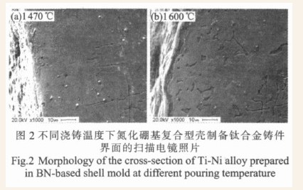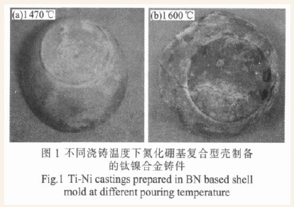 (1)在1470℃的Ti-50%Ni(原子分数)形状记忆合金熔体浇铸条件下,氮化硼基复合型壳具有很好的铸造性能,有足够的耐火度、理想的流动性和复型能力。以六方氮化硼为面层基材的复合熔模精铸型壳,可以作为氧化钇、氧化锆或钨粉等钛合金熔模精密型壳面层材料的替代品。